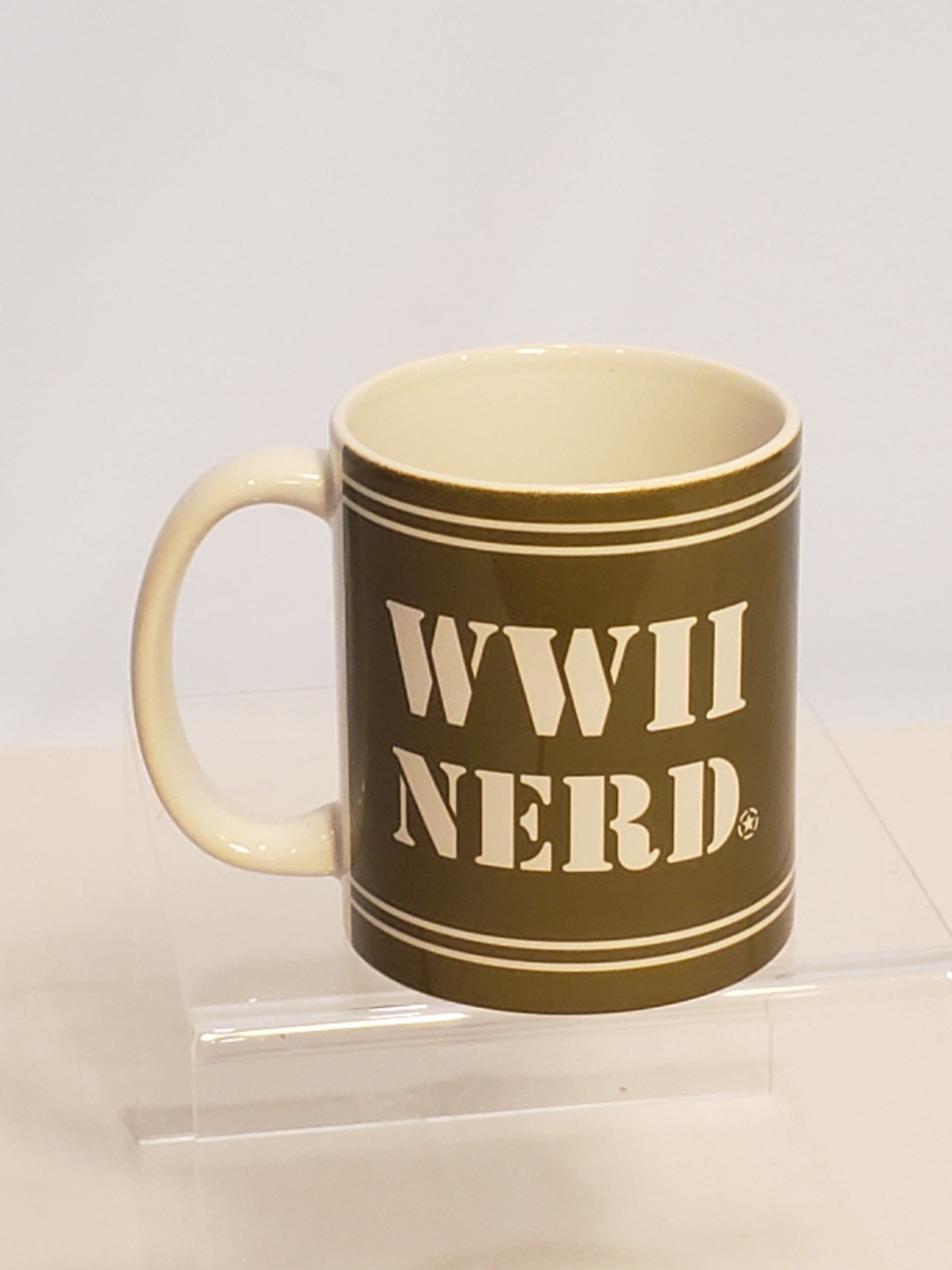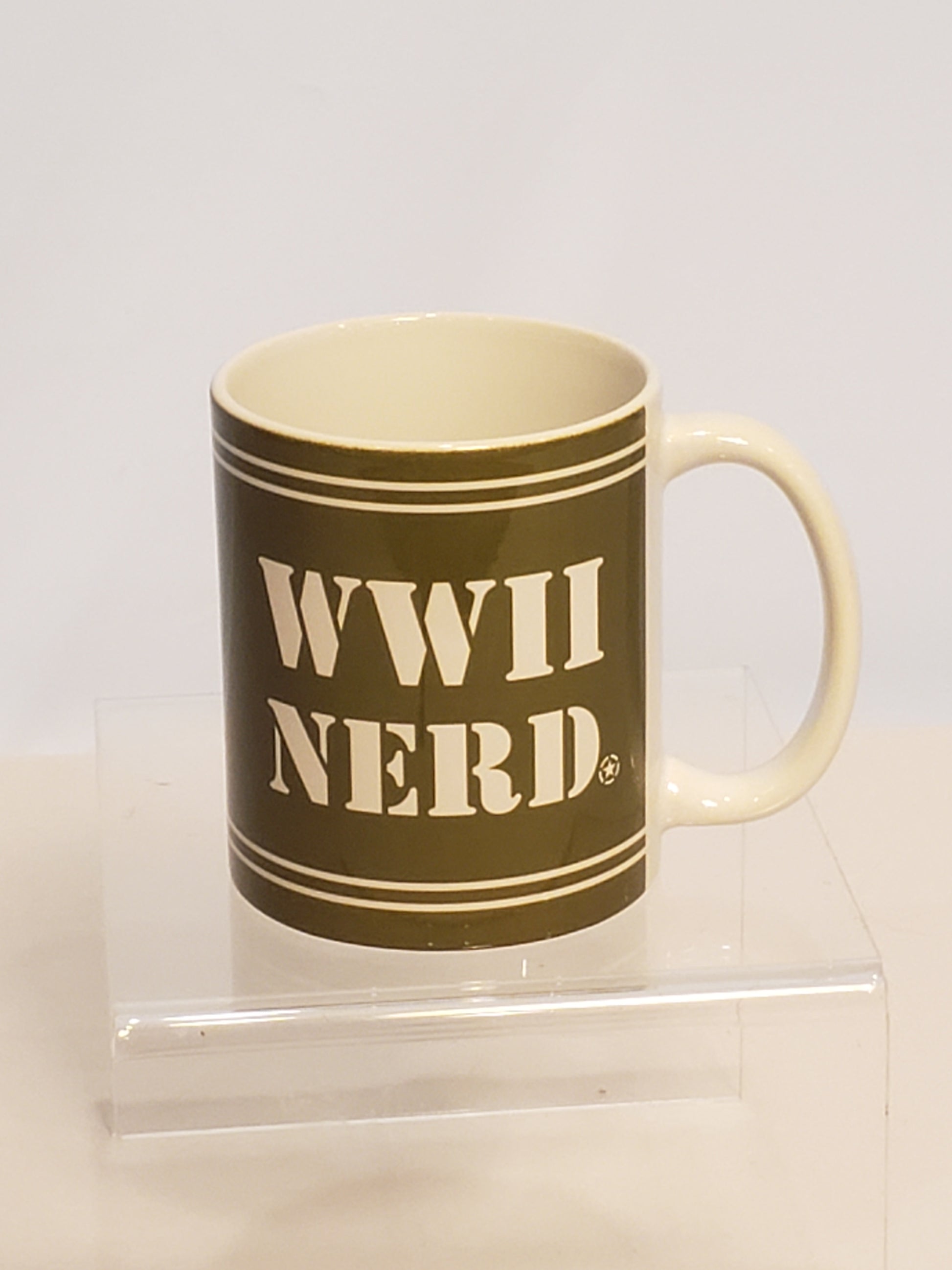 Part of the WWII Nerd Collection for true WWII enthusiasts. This 11 oz. mug is great for hot or cold beverages. As featured items also our WWII Nerd magnet 3 1/2x 2 3/4, Nerd Sticker 3 1/4 x 2 1/2, and Nerd Pin. Also see our WWII Nerd Tee Shirt, and Hooded Sweatshirt,